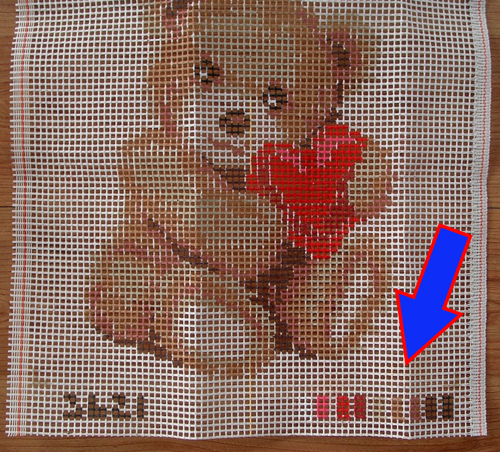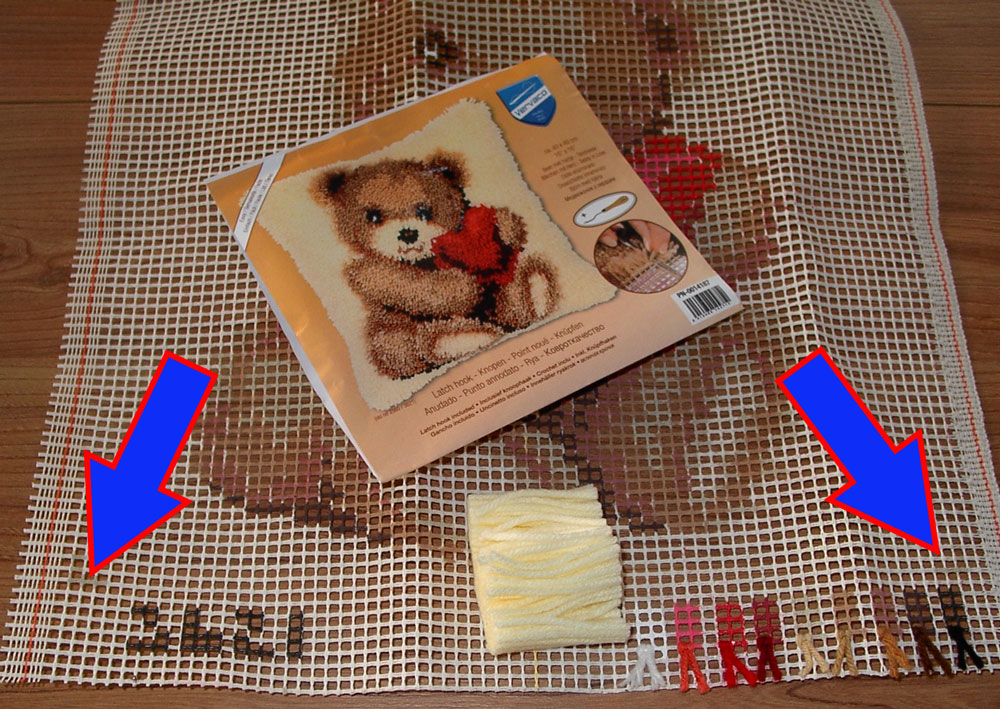 Is de achtergrondkleur niet op het stramien geschilderd, dan wordt met hoekjes (zie pijlen) aangeduid waar de tekening begint en eindigt, zowel bovenaan als onderaan op het stramien. Knoop niet voorbij deze hoekjes! Daar is de hoeveelheid draad in je pakket niet op voorzien en bovendien heb je ongeknoopte randen nodig om te zomen of een rug tegen te naaien.