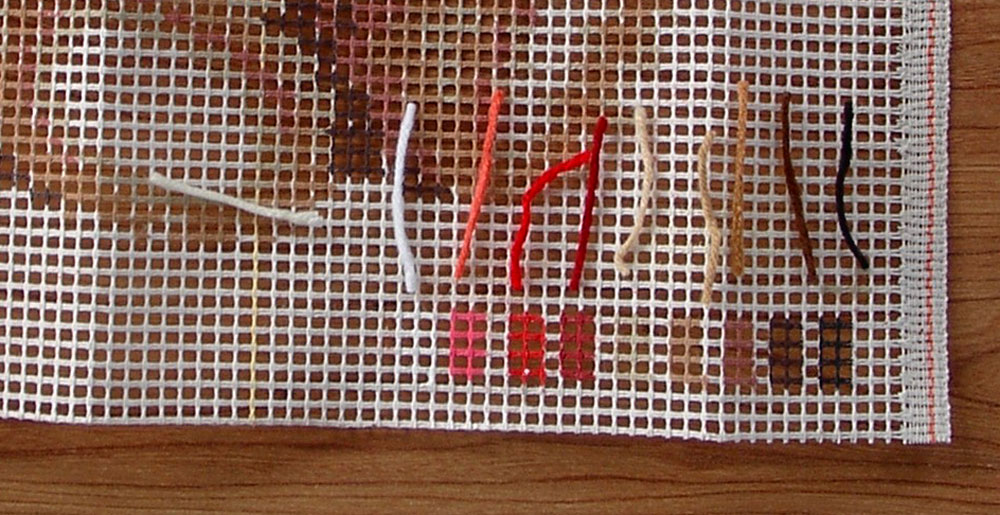 Heeft de tekening een egale achtergrond, dan is deze meestal niet op het stramien geschilderd en is ze ook niet in de legende aangegeven. In dat geval heb je dus 1 kleur garen meer dan er blokjes zijn
