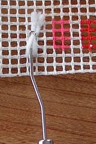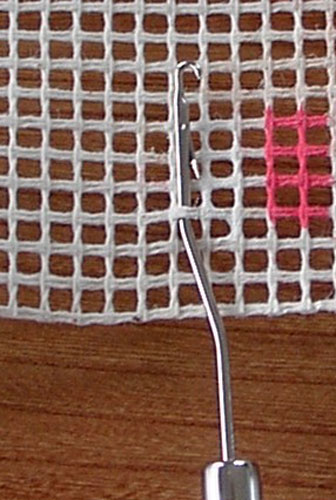 1. Steek de knoophaak onder de dwarsdraad van het stramien tot het beweegbare lipje van de haak boven de dwarsdraad ligt.