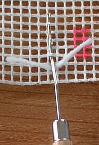 4. Laat de uiteinden van het draadje los en trek nu de haak met het draadje door de ontstane lus. Hou daarbij het stramien tegen. Is de haak uit het stramien, dan is de knoop gemaakt.