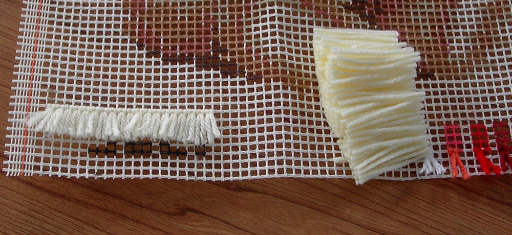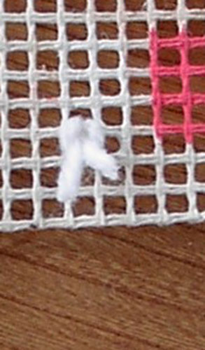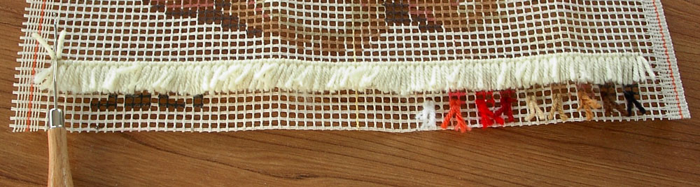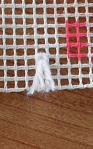 Wordt het vierkant of rechthoekig, dan heeft het stramien aan 2 zijden een zelfkant. Aan de andere twee zijden is het stramien doorgeknipt. Die geknipte kanten kan je ineens omplooien tot tegen de tekening, zodat je bij de eerste en laatste paar rijen je knopen kan maken over dubbel stramien.