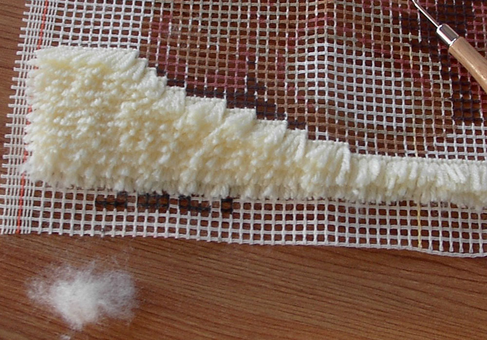 Tijdens het knopen komen er pluizen op het werk te liggen. Verwijder die regelmatig door voorzichtig, in alle richtingen, met de platte hand over het geknoopte gedeelte te wrijven.